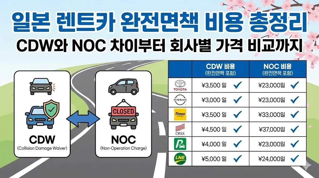 렌터카 전문가 조언 : 일본 렌트카 예약 시 가장 중요한 것은 보험 구성을 정확히 확인하는 것입니다. CDW만 포함된 경우 NOC는 별도로 부담해야 하므로, 완전면책(CDW+NOC)이 모두 포함되었는지 반드시 체크하세요. 특히 한국 예약 사이트 이용 시 약관을 꼼꼼히 읽어보시길 권합니다.