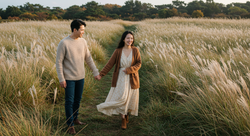 가장 쉬우면서도 세련된 커플룩 연출법은 '톤온톤(Tone-on-Tone)' 매치입니다. 베이지, 브라운, 크림, 카키 등 비슷한 계열의 가을 컬러를 정해서 각자 다른 아이템으로 스타일링하는 방식이에요. 예를 들어, 여자는 베이지색 롱 원피스를, 남자는 같은 톤의 베이지색 니트나 셔츠를 입는 거죠. 전체적인 색감의 통일감 덕분에 함께 있을 때 훨씬 안정적이고 조화로워 보인답니다.