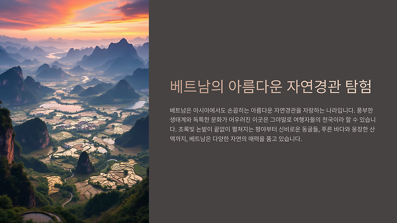초록빛 논밭이 끝없이 펼쳐지는 평야부터 신비로운 동굴들, 푸른 바다와 웅장한 산맥까지, 베트남은 다양한 자연의 매력을 품고 있습니다.