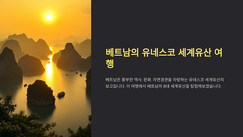 베트남은 유네스코(UNESCO)가 인정한 세계유산의 보고로, 풍부한 역사와 문화, 그리고 뛰어난 자연경관을 자랑합니다.