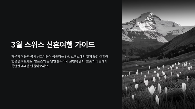 안녕하세요! 이번 글에서는 한층 설레는 신혼부부들을 위한 3월 스위스 신혼여행 정보를 가득 담아보았습니다.스위스는 사계절 내내 아름답지만, 3월은 겨울의 여운과 봄의 싱그러움이 공존해 더욱 낭만적인 분위기를 연출합니다.