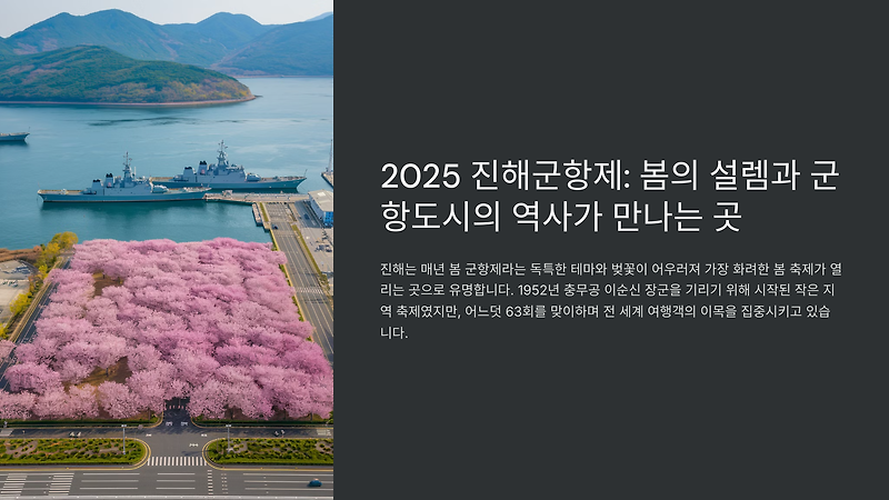 그럼 이제부터 2025 진해군항제 속 매력적인 스팟과 행사 일정을 자세히 살펴보고, 효율적인 여행 루트를 만들기 위한 꿀팁까지 공유해 드릴게요. 오감이 즐거워지는 이 축제의 현장 속으로 함께 떠나봅시다!