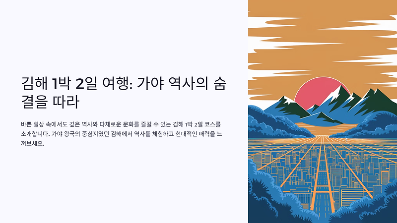 바쁜 일상 속에서도 깊은 역사와 다채로운 문화를 즐길 수 있는 국내 여행지를 찾고 있다면, ‘가야 역사’의 숨결이 살아 숨 쉬는 김해 1박 2일 코스가 제격입니다.