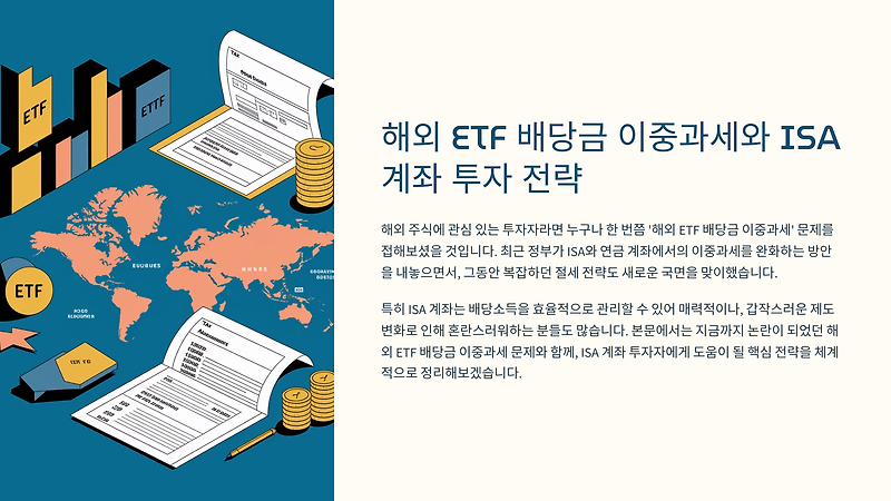 본문에서는 지금까지 논란이 되었던 해외 ETF 배당금 이중과세 문제와 함께, ISA 계좌 투자자에게 도움이 될 핵심 전략을 체계적으로 정리해보겠습니다.