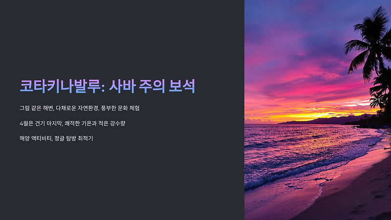 특히 4월은 건기의 마지막 시기로, 쾌적한 기온과 적은 강수량 덕분에 해양 액티비티나 정글 탐방을 즐기기에 제격이랍니다.