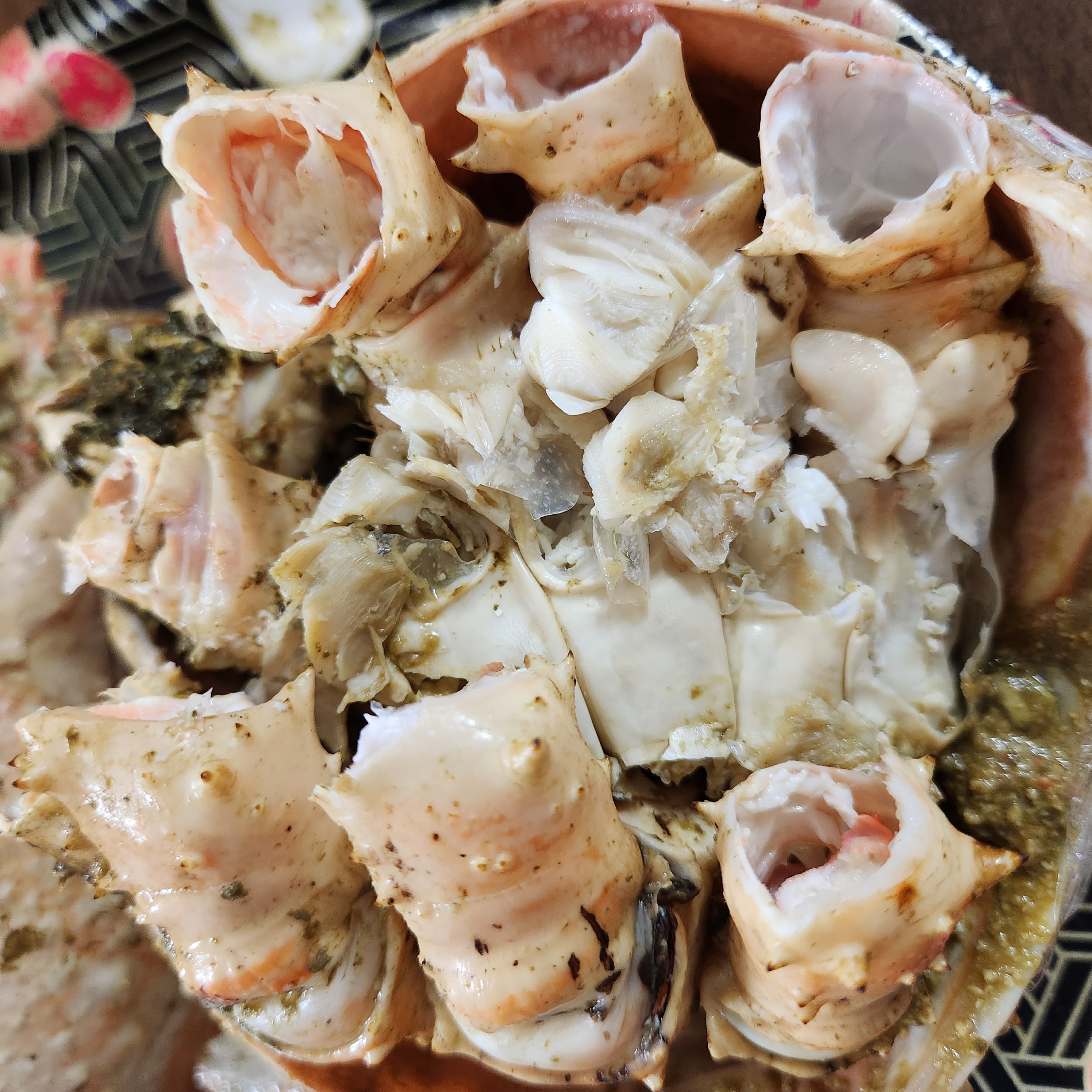 킹크랩을 한 마리씩 꺼내놓았어요. 킹크랩의 껍질을 열면서