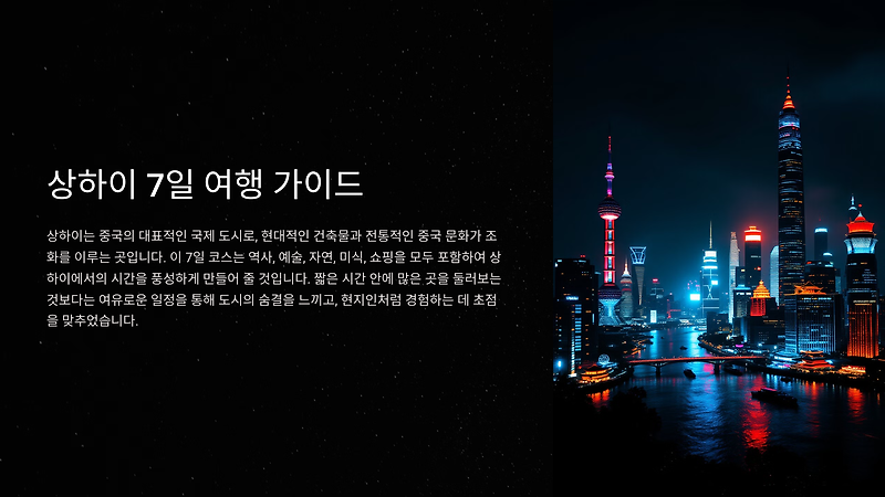이 7일 코스는 역사, 예술, 자연, 미식, 쇼핑을 모두 포함하여 상하이에서의 시간을 풍성하게 만들어 줄 것입니다. 짧은 시간 안에 많은 곳을 둘러보는 것보다는 여유로운 일정을 통해 도시의 숨결을 느끼고, 현지인처럼 경험하는 데 초점을 맞추었습니다.